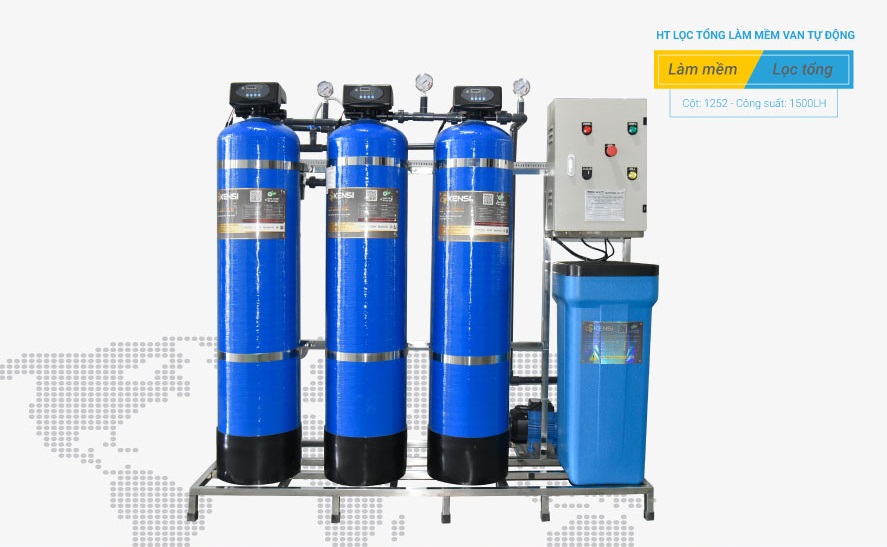 Hệ thống lọc nước tổng làm mềm 3 cột composite van tự động 1500LH là hệ thống xử lý nước đầu nguồn hiện đại, chuyên dụng. Thiết bị gồm 3 cột lọc 1252 composite với công suất lọc đạt 1500LH. Các cột lọc chứa hạt vật liệu chuyên dụng, theo đó, nước đầu nguồn sẽ lần lượt chảy qua từng lớp vật liệu của các cột lọc. Xử lý tạp chất, cặn bẩn, chất lơ lửng, khử kim loại nặng, làm sạch màu, mùi và làm mềm nước.