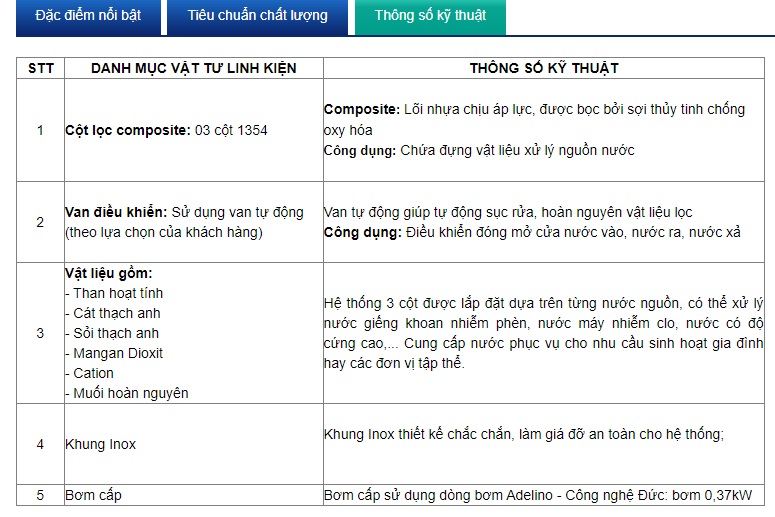 Cấu trúc của hệ thống gồm ba cột lọc chính và một cốc lọc tinh. Cột lọc đa tầng là giai đoạn xử lý đầu tiên, sử dụng các vật liệu như sỏi thạch anh, cát thạch anh và Mangan dioxit để loại bỏ tạp chất có kích thước lớn, huyền phù và phù du. Cột lọc cacbon tiếp theo sử dụng sỏi lọc nước, cát lọc nước và than hoạt tính gáo dừa để khử màu, mùi và hấp thụ kim loại nặng. Cột lọc cation cuối cùng sử dụng hạt Cation để loại bỏ các ion Ca2+ và Mg2+ gây cứng nước. Cuối cùng, qua cốc lọc tinh với lõi lọc PP 20", nước được ngăn chặn bụi bẩn, bùn đất và rỉ sét trước khi chuyển vào bồn chứa.