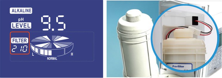Thông báo thay lõi lọc được phát qua giọng nói và hiển thị trên màn hình Nó được thiết kế để bạn có thể kiểm tra mức độ sử dụng của lõi lọc trên màn hình và thông báo thay lõi lọc được báo qua giọng nói và tín hiệu trên màn hình