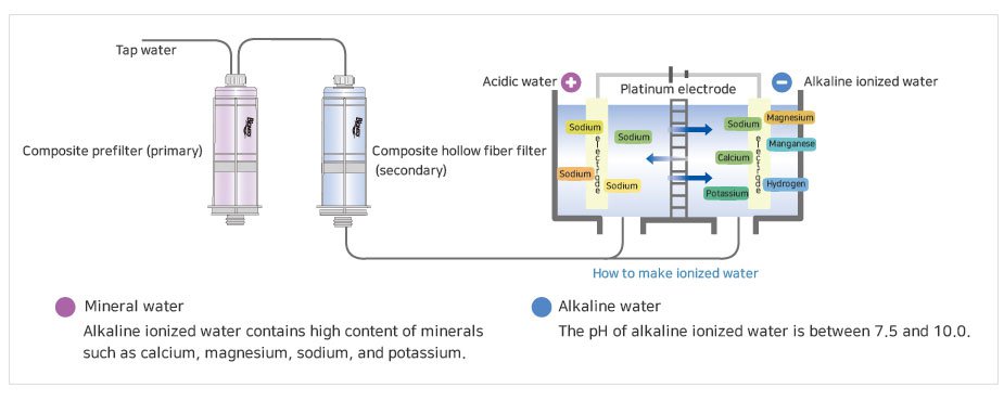 và Canxi được tập trung tới bảng cực âm, tạo ra nước ion kiềm, và ion âm được tập trung tới bảng cực dương, tạo ra nước axit điện giải.