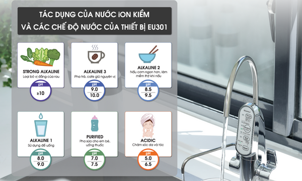 Không chỉ tạo ra nước sạch như các máy lọc nước thông thường, EU301 còn sử dụng công nghệ điện giải đỉnh cao của Nhật Bản để tạo ra nước uống tốt cho sức khỏe, đó chính là nước ion kiềm. 06 loại nước máy tạo kiềm EU301 làm ra gồm: Nước axit yếu (pH 5.5 - 6.6) dùng để làm sạch các loại mì sợi, udon trước khi chế biến (không dùng để uống trực tiếp); Nước lọc (pH = 7) để uống trực tiếp, pha sữa, uống thuốc Tây; Nước kiềm cấp độ 1 (pH 8 - 9) nước uống cho người mới bắt đầu; Nước kiềm cấp độ 2 (pH 8.5 - 9.5) nước uống và nấu cơm; Nước kiềm cấp độ 3 (pH 9 - 10) nước uống, pha trà, nấu súp và hầm; Nước ion kiềm mạnh (pH 9 - 10) dùng để ngâm rau củ quả.
