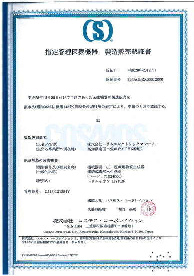 Trim ion được chứng nhận là thiết bị Y tế, mỗi thiết bị có mã quản lý thiết bị y tế do bộ y tế của Nhật Bản cấp.