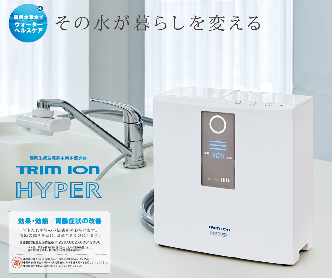 Máy điện giải ion kiềm Trim Ion Hyper có thể tạo ra 8 loại nước khác nhau với các công dụng và mục đích sử dụng khác nhau. Các loại nước bao gồm: nước axit pH 3.0-3.5, nước axit pH 5.5, nước tinh lọc pH 7.0-7.5, nước Hydro mức 1, nước Hydro mức 2, nước Hydro mức 3, nước Hydro mức 4, và nước Hydro Turbo siêu kiềm.