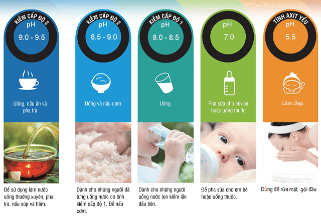 - Nước ion kiềm cấp độ 2 pH ~ 8.5 – 9.0: Nước uống và nấu cơm.