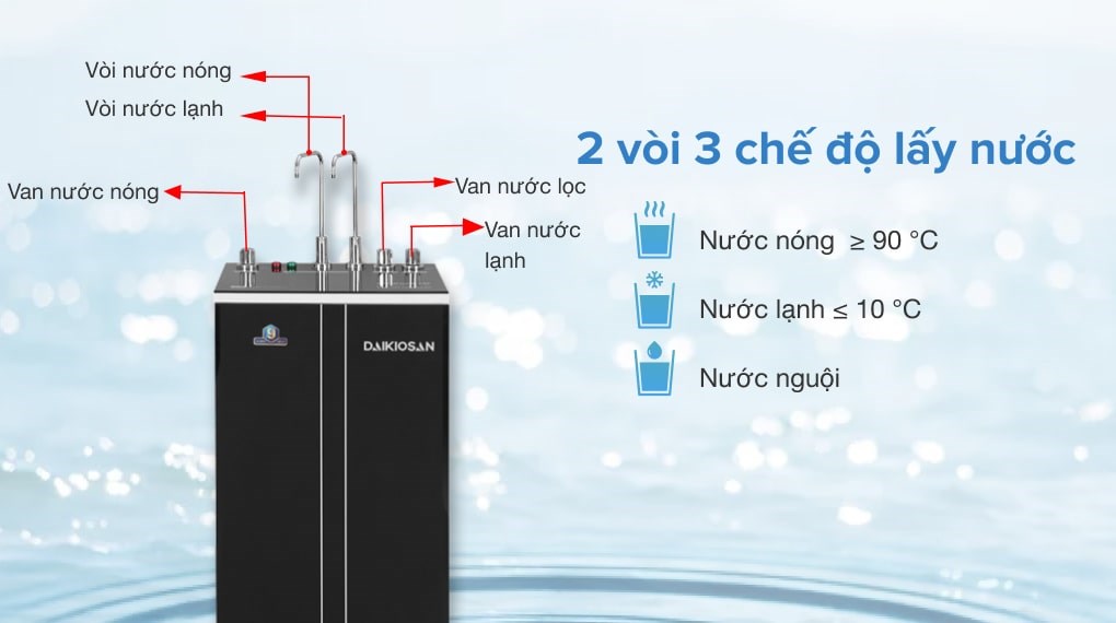 Máy cung cấp ba loại nước: nóng, nguội và thường để phục vụ các nhu cầu khác nhau của gia đình. Bạn có thể dùng nước lạnh để uống trực tiếp hoặc làm đá viên, sử dụng nước thường cho việc rửa rau quả hoặc làm sinh tố. Ngoài ra, máy còn có khả năng tạo ra nước kiềm (Alkaline) trung hòa axit, giúp cân bằng pH trong cơ thể và tăng cường sức khỏe.