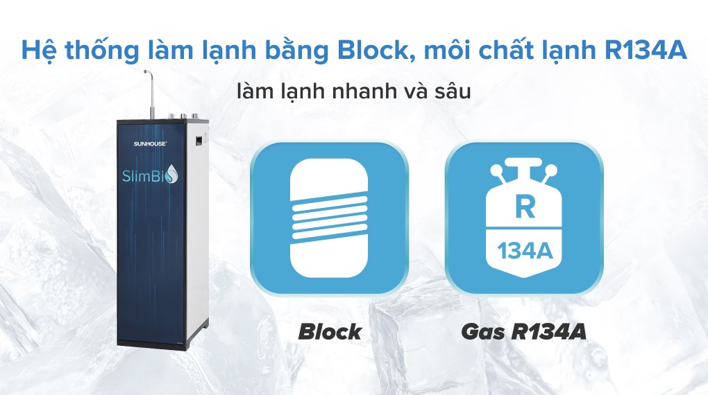 Máy có hệ thống van điện từ giúp kiểm soát nguồn nước, ngăn không cho nước tự do đi vào các lõi lọc và ngăn không cho nước thải chảy ngược trở lại. Ngoài ra, công nghệ làm lạnh bằng block gas giúp máy giữ nhiệt độ của nước lạnh hơn và kéo dài tuổi thọ của máy.